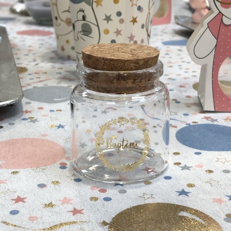 POT EN VERRE BOUCHON LIEGE BAPTEME 4,5CMX,5,5CM
